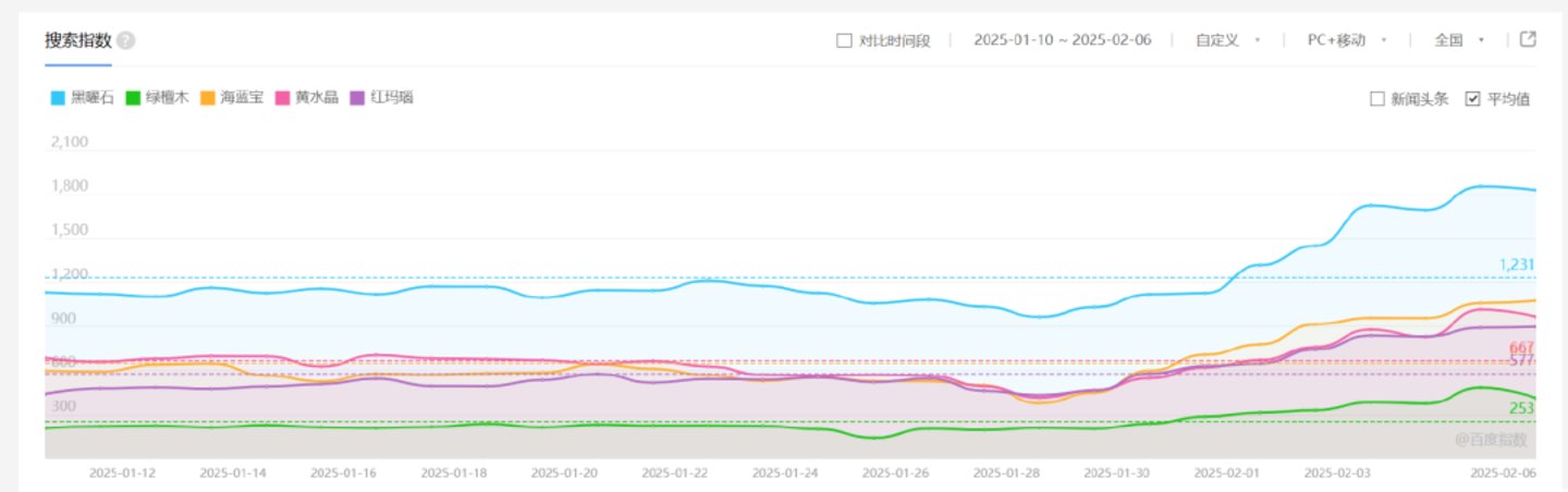 自 2024 年下半年起,众多明星下场带货水晶,水晶的热度和价格一路飙升。而 DeepSeek 的出现,更是将黑曜石、绿檀木、红玛瑙、海蓝宝等泛水晶品类推向了新的高峰。