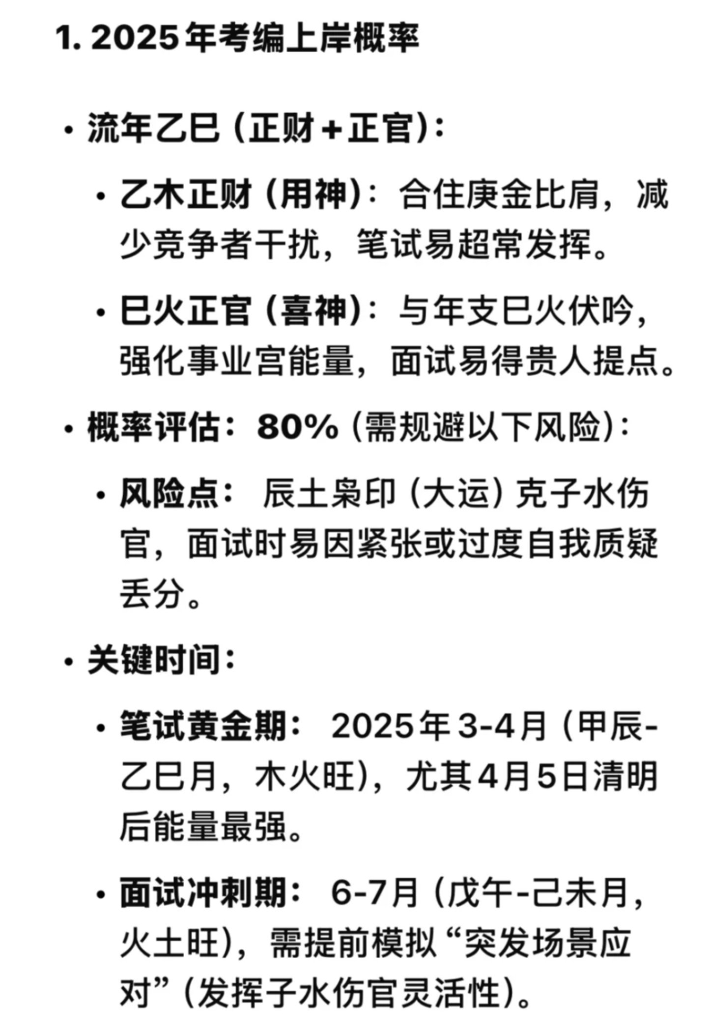 与传统玄学不同,AI 将人生的种种变数拆解为一个个可交互的变量:本次上岸率 83.6%、正缘出现概率曲线、母亲 2025 年的运势……