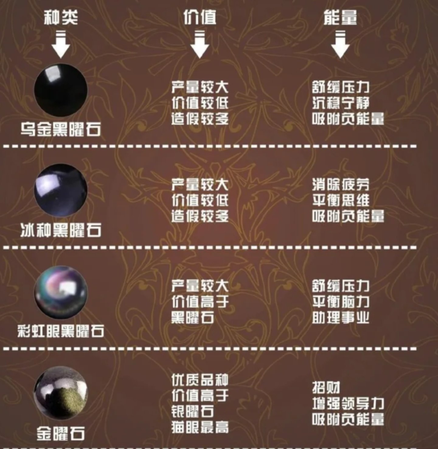 有散发金色光效的金曜石、白银光效的银曜石、透光的冰曜石、彩色光效的彩曜石、透彩色光的冰彩曜石,以及最常见的全黑乌金黑曜石。