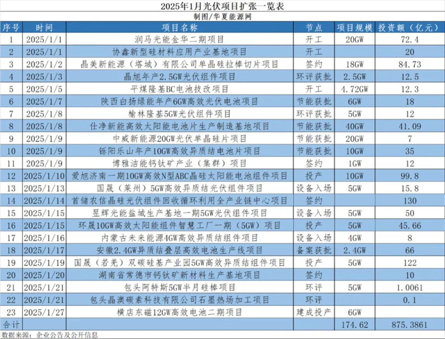 华夏能源网统计发现,2025年1月,光伏全产业链就有23个项目进行公示、签约、开工、建设等,总规模近175GW,总投资额超875亿元。