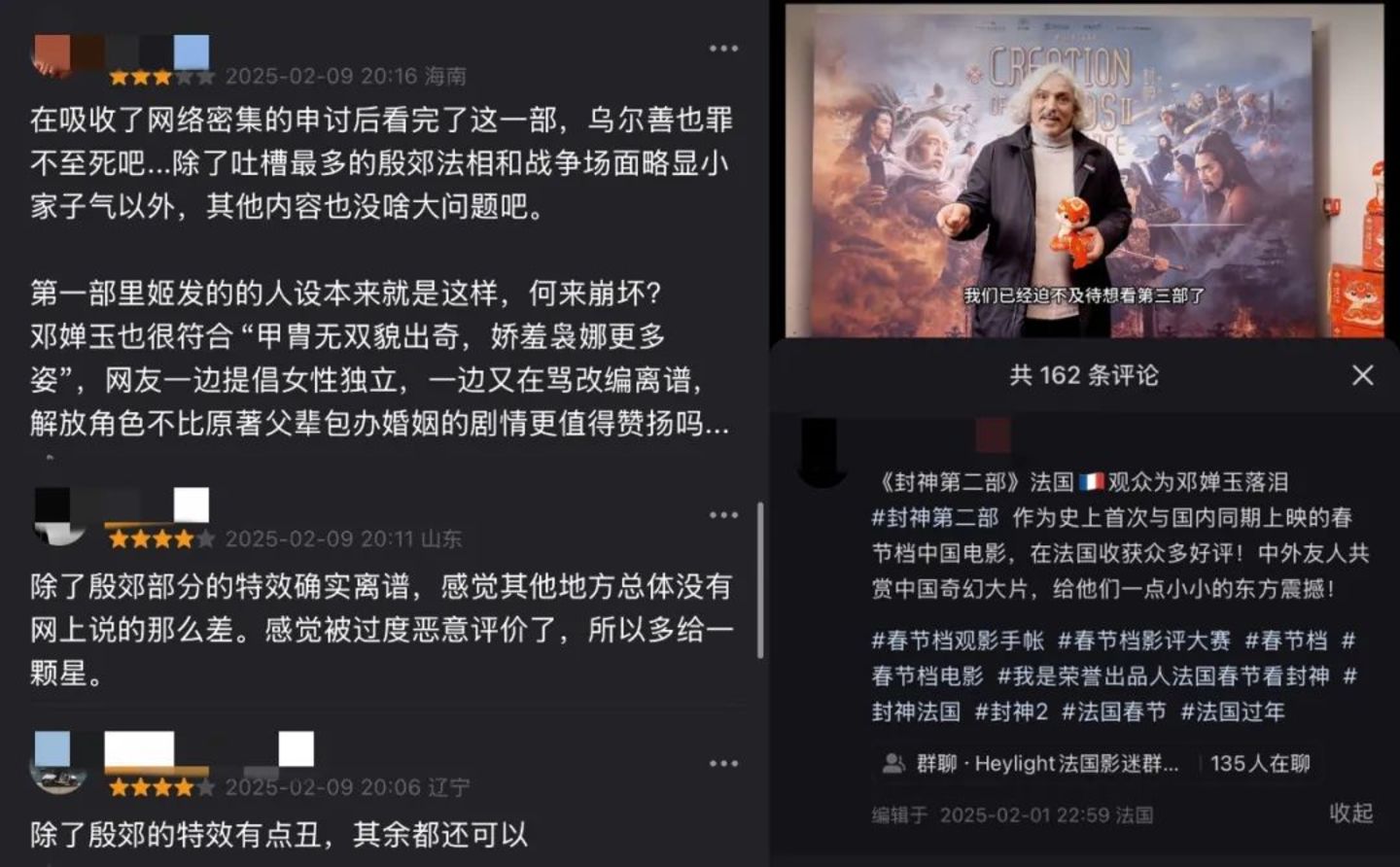 在春节档的潮水褪去之后,如今再打开豆瓣观察最新的短评,已经有不少三星、四星的真实评价陆续涌现。在海外上映后,《封神2》也收获了不少海外观众的好评,成为2025年法国影院第一部售罄的电影。