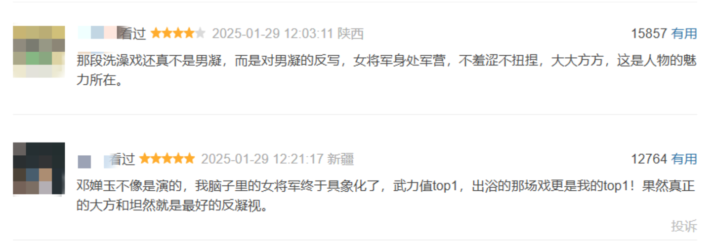 邓婵玉塑造之好,已经不仅仅是演员本身在动作戏、马戏等方面所呈现出的个人素质,更是发乎于微末之处的。比如帐中洗澡的段落中,副将上前禀报军情,但邓婵玉面不改色,从容着装,反而是作为男性的副将自先羞赧难当。这是刨去凝视视角展现女性身体的难得范例,让女将军的形象不仅仅停留在表面,而是深入肌理。