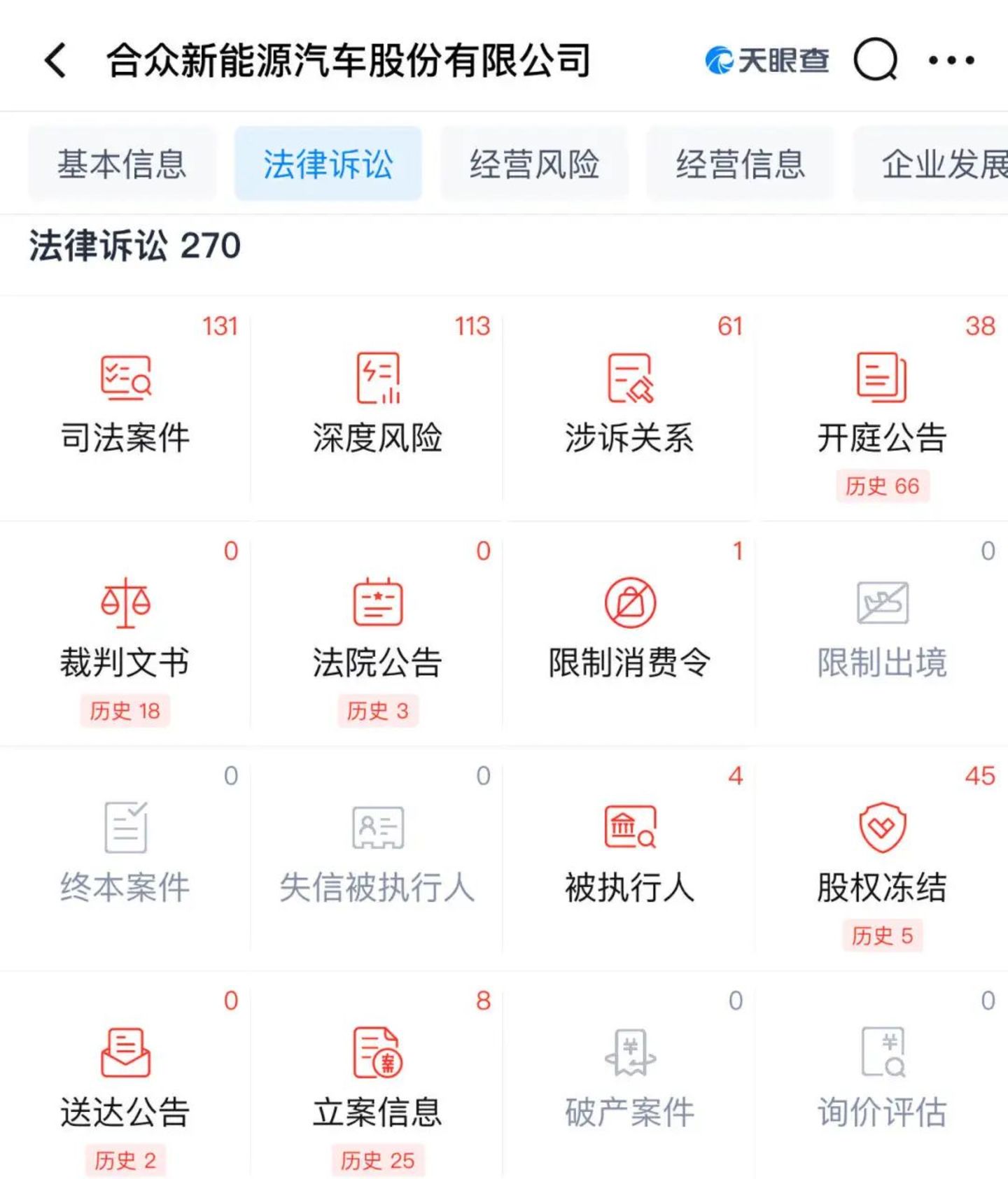 据天眼查信息显示,自成立以来,哪吒汽车母公司合众新能源已经有270起诉讼案件,司法案件113起,四次被列为被执行人,执行总金额7339万元。
