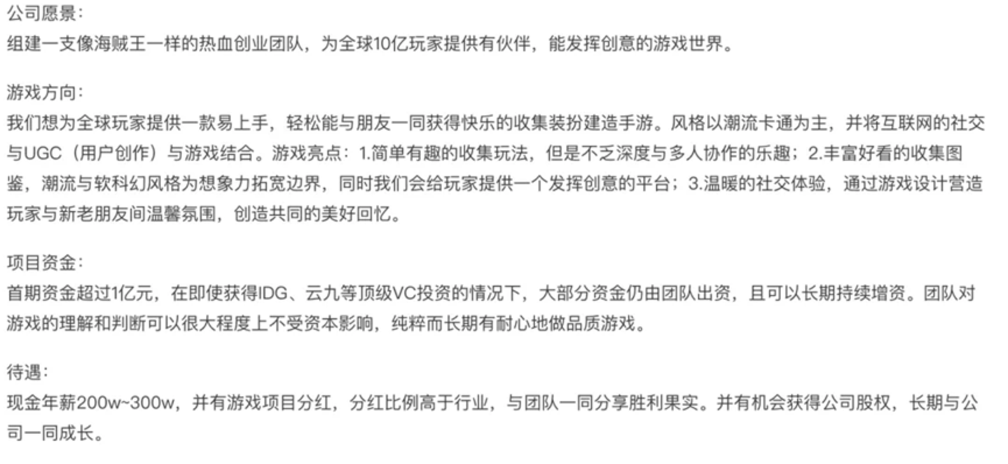 船岛游戏可以说是财大气粗。查询天眼查相关融资历程,可以发现,公司获得首期资金超过1亿元,在即使获得IDG、云九等顶级VC投资的情况下,大部分资金仍由团队出资,且可以长期持续增资,团队对游戏的理解和判断可以很大程度上不受资本影响,纯粹而长期有耐心地做品质游戏。而船岛游戏前两年招聘TA(技术美术)负责人开出的待遇,更是来到200w~300w现金年薪,并承诺游戏项目分红比例高于行业。