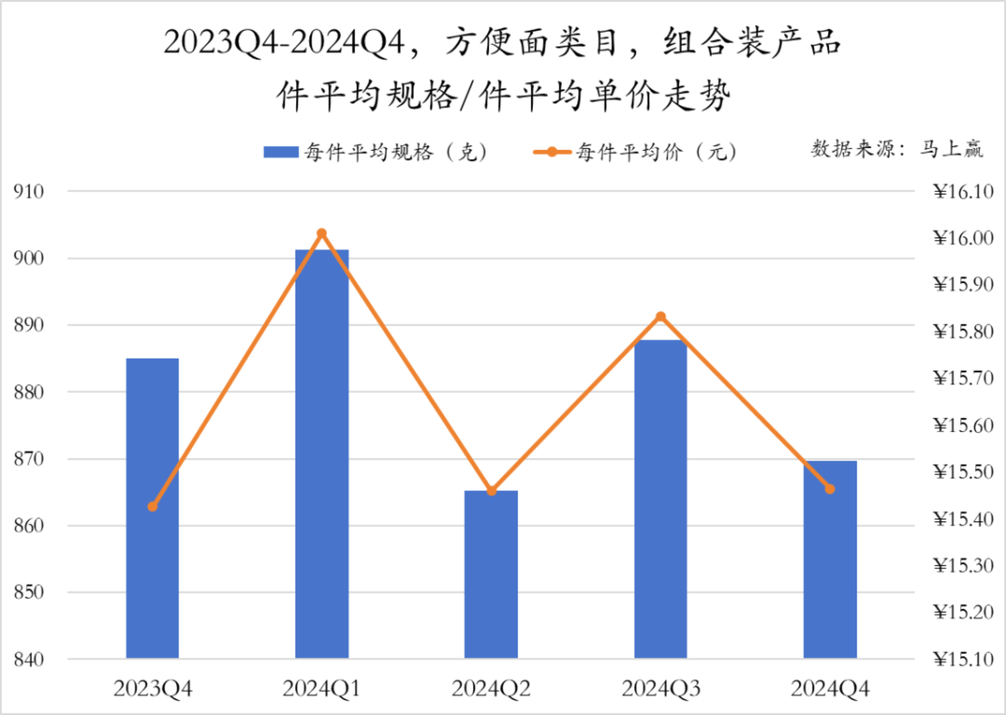 方便面类目中的组合装产品,件平均规格和件平均单价的变化趋势一致,呈现出明显的季节性波动,节假日与旅游的高频消费场景在Q1和Q3的出现,使得规格和单价均有所上升。而Q2与Q4的消费热度整体回落,2024年Q4件平均规格相比同期有所下降,件平均单价持平,整体价格/规格均有轻微的下降趋势。