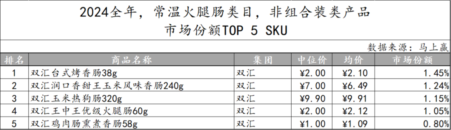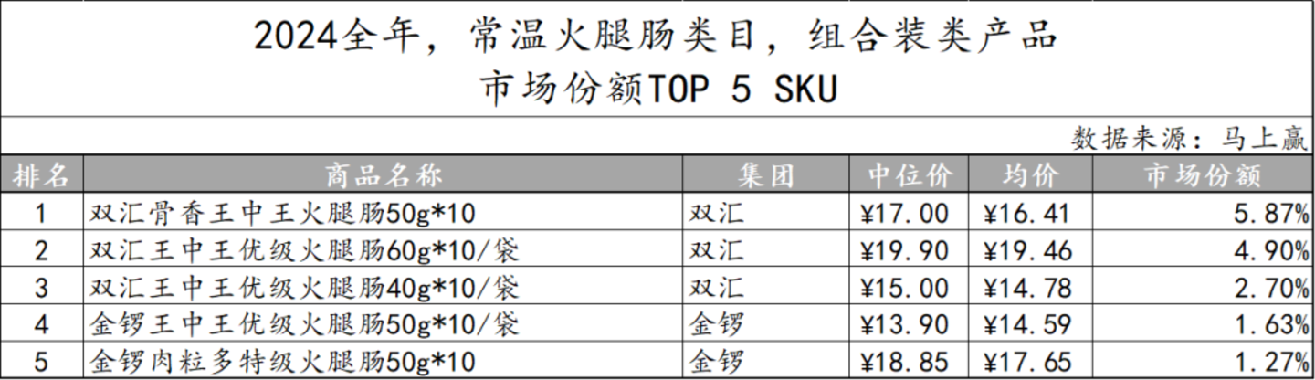 在非组合装产品中,双汇更是一家独大,以各类规格和价格的产品包揽市场份额前五名,显示出品牌的高度集中。