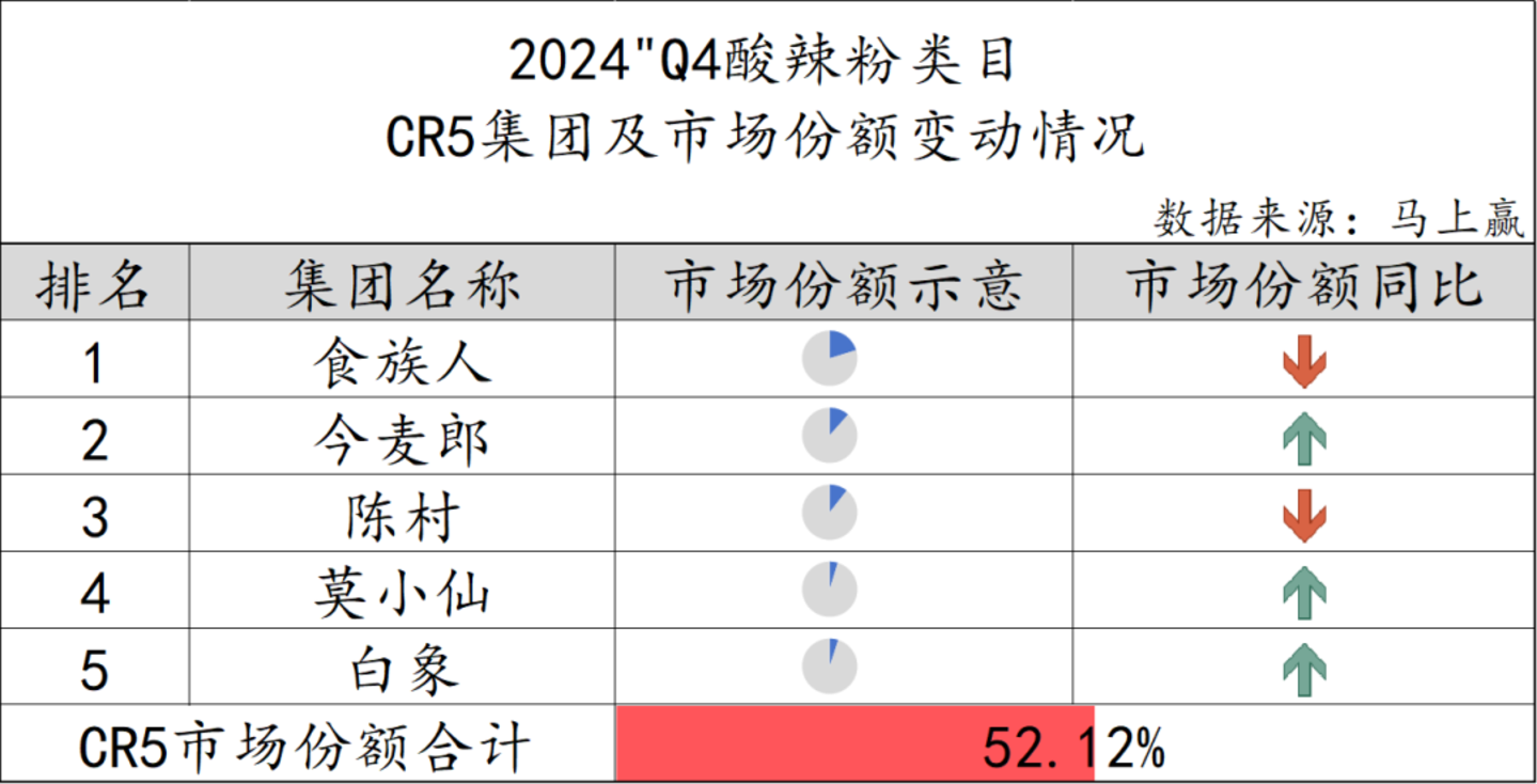 酸辣粉类目整体集中度不高,CR5集团的市场份额总和仅为52.12%。具体来看,食族人虽然在市场份额中排名第一,但其同比有所下降,相比来说,今麦郎、莫小仙和白象的市场份额则同比有所上升,类目整体市场竞争较为激烈。