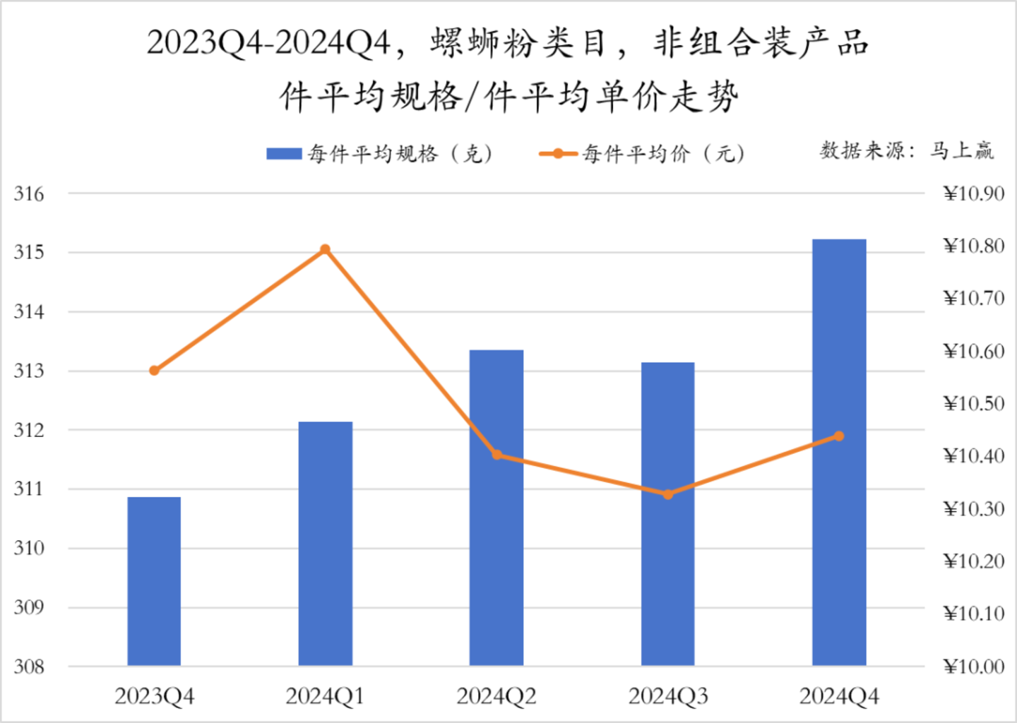 在过去五个季度中,螺蛳粉类非组合装产品的均平均规格整体呈上升趋势,尤其是在2024年Q4件均规格增长幅度较大;在件平均单价方面,螺蛳粉类目的价格有所波动,在2024Q1之后有一定的下滑趋势。
