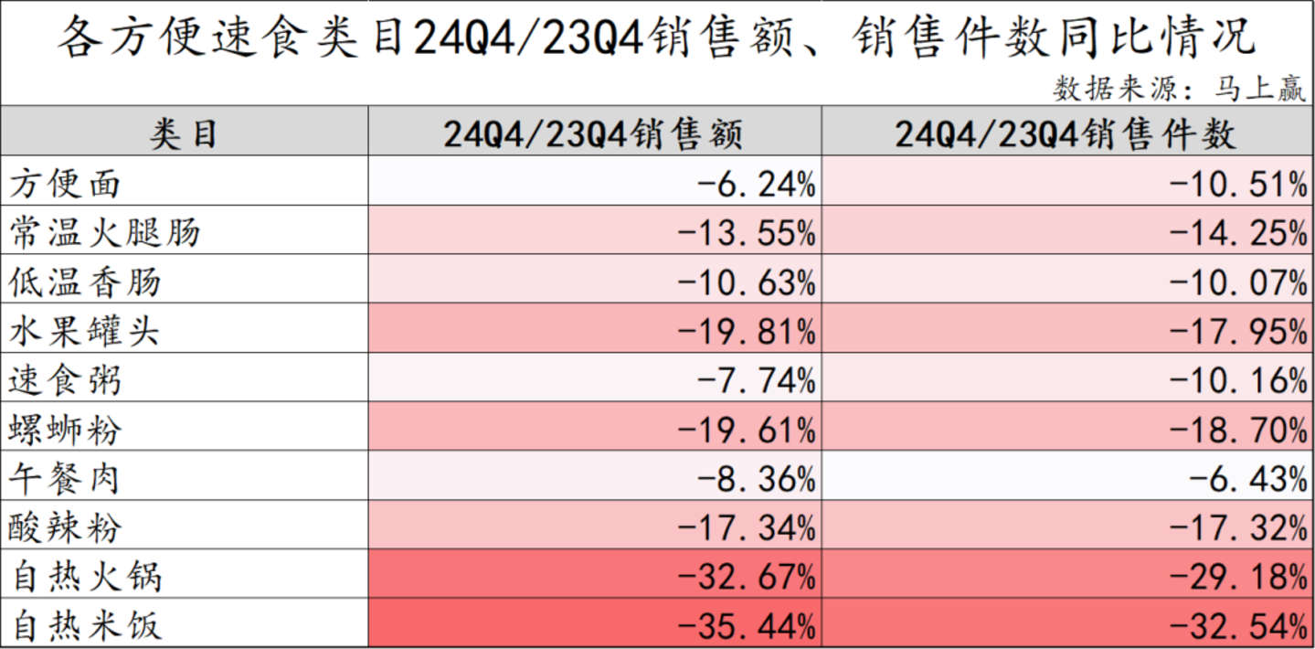 在方便速食大类中,本季度我们重点选择了:方便面、常温火腿肠、低温香肠、水果罐头、速食粥、螺蛳粉、午餐肉、酸辣粉、自热火锅、自热米饭几个较有典型性与代表性的类目进行类目市场情况回顾。以2024Q4市场份额计算,上述重点类目在方便速食中的市场份额合计>92%。