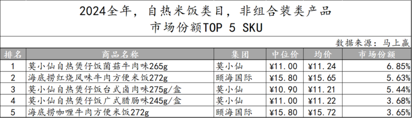 2024年全年自热米饭类目非组合装产品市场份额TOP 5 SKU中,莫小仙集团具有较强市场影响力,占据三个席位,而颐海国际也以两款产品展现出较强竞争力。但从规格角度来看,自热米饭类目的市场份额TOP 5各产品的产品类型差距相对较小,区别主要集中在品牌与口味上。
