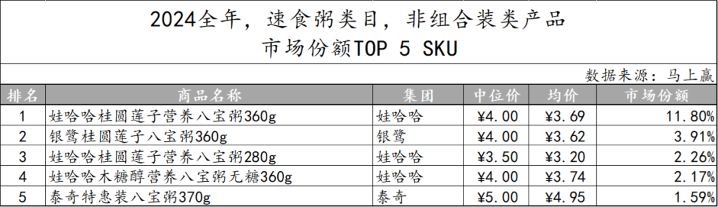 2024全年速食粥类目中非组合装类产品的市场份额TOP 5 SKU中,娃哈哈集团独占三个席位,更是有一款单品市场份额超过10%。在第二-第五名中,也有两款娃哈哈集团的产品上榜。