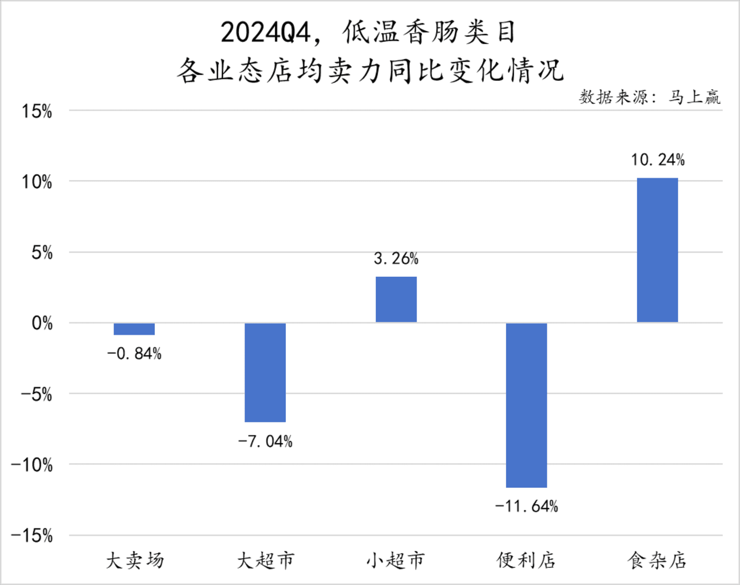2024Q4 低温香肠类目不同业态的店均卖力同比变化情况显示,食杂店同比增速较为突出,实现了 10.24% 的正增长,小超市的店均卖力也有小幅度提升。