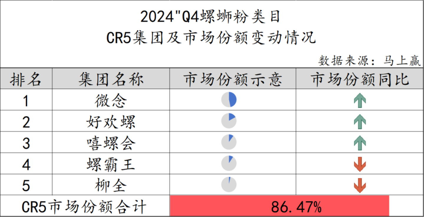 在螺蛳粉类目中,微念、好欢螺、嘻螺会、螺霸王、柳全共占据 86.74% 的市场份额,市场集中度较高。集团的同比变化来看,仅有螺霸王、柳全的市场份额下降,其余集团市场份额均有所提升。