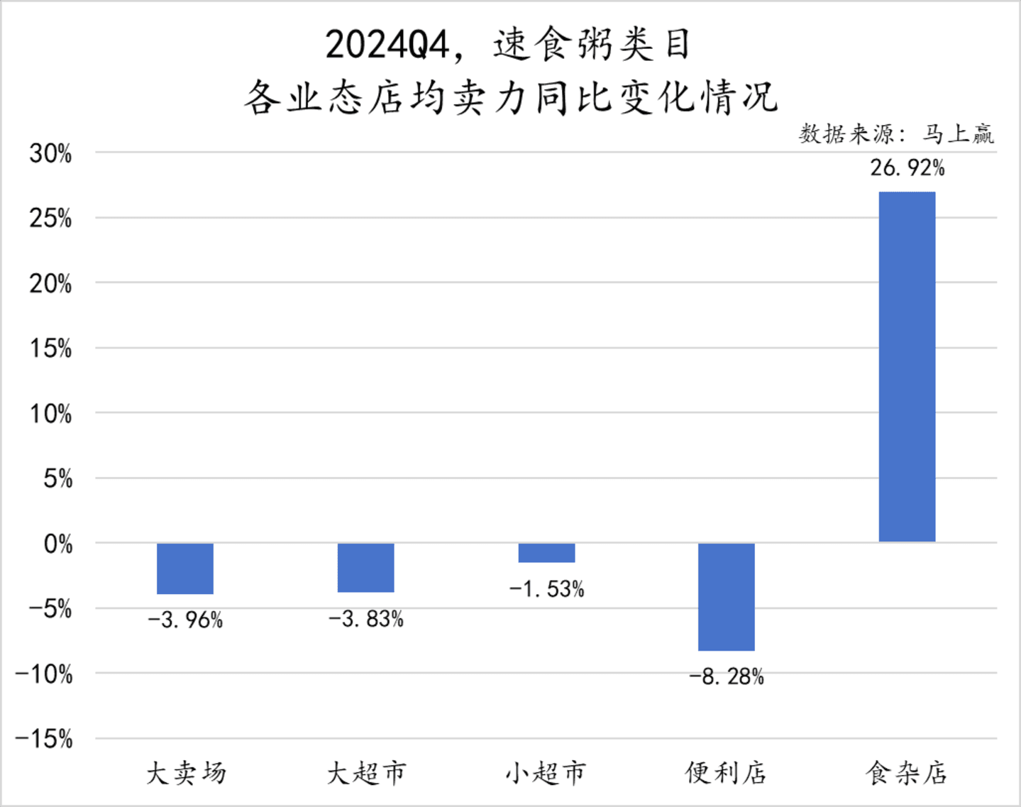 在不同业态的店均卖力方面,食杂店的店均卖力同比增长26.92%,远超其他业态。相比之下,大卖场、大超市、便利店和小超市则均呈现不同程度的下滑。