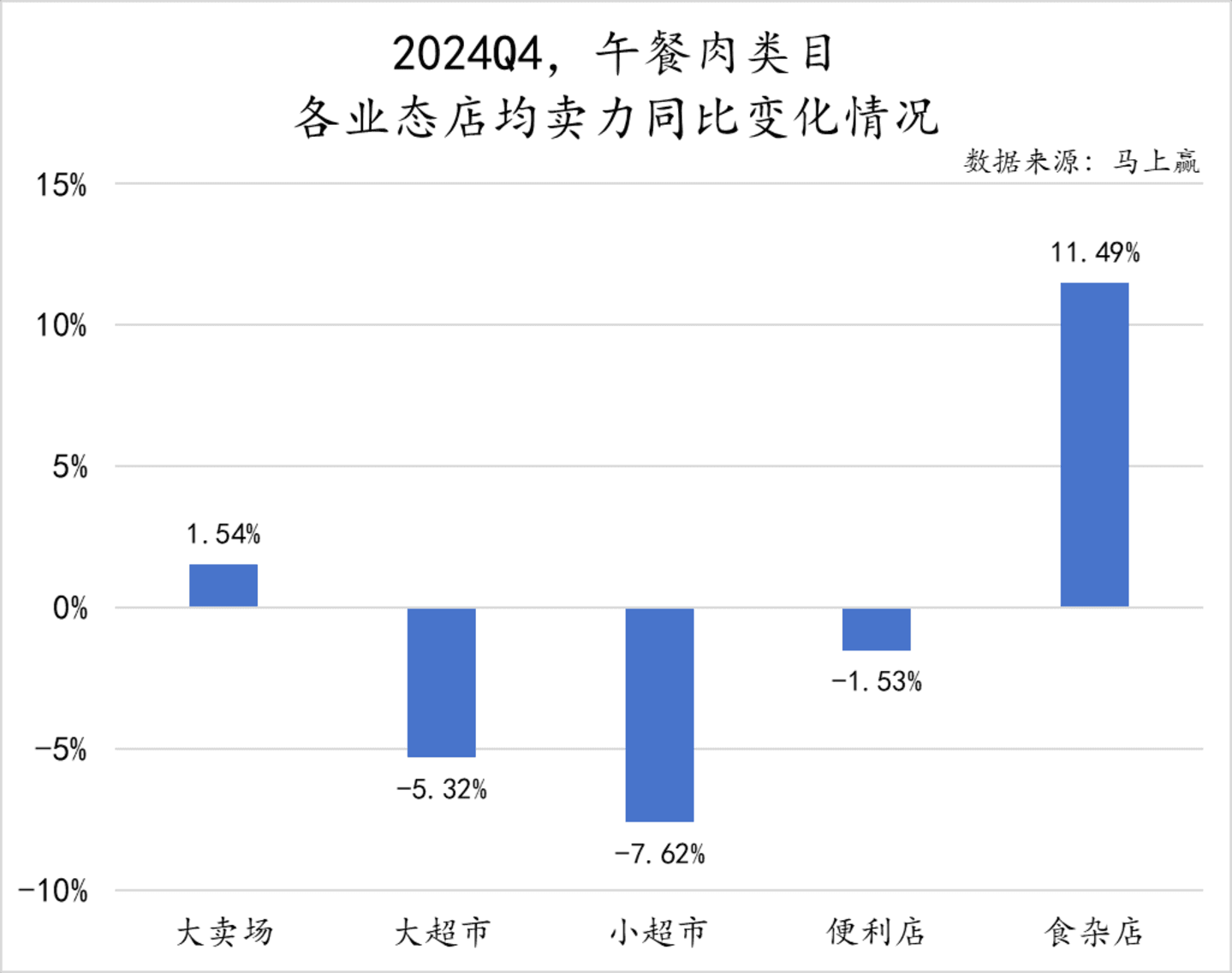 2024Q4午餐肉类目的店均卖力同比变化情况中,食杂店的店均卖力同比增长11.49%,表现最为突出,大卖场也实现了1.54%的同比正向增长。而大超市、小超市和便利店的店均卖力则出现了不同程度的下降。