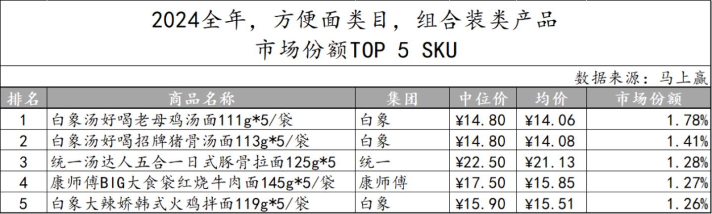 基于2024全年方便面类目的市场份额TOP SKU情况可以看到,在组合装产品中,有三款产品均来自白象集团,分别隶属于汤好喝与大辣娇两个品牌,其影响力不容小觑。除此以外,统一、康师傅也各有一个SKU上榜。