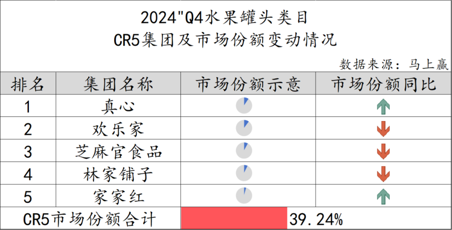 水果罐头市场中CR5集团的市场份额总计39.24%,相比方便食品其他类目而言集中度很低,市场份额较为分散,也给其他集团留下了更多的市场机会。真心集团和家家红集团的市场份额同比有所上升,而欢乐家、芝麻官食品和林家铺子的市场份额则有所下滑。