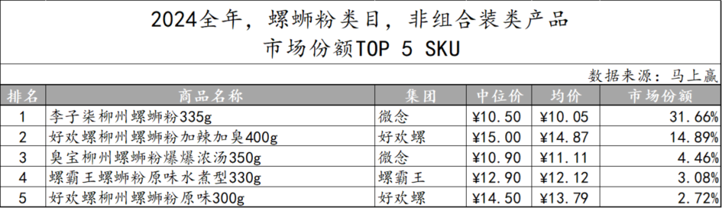 2024年螺蛳粉类目非组合装类产品的市场份额TOP 5 SKU中,头部品牌在市场中占据较大份额。微念集团和好欢螺集团均有两款产品上榜,其中”李子柒柳州螺蛳粉335g“以31.66%的市场份额遥遥领先,而螺霸王也占有3.08%的市场份额,表现不俗。