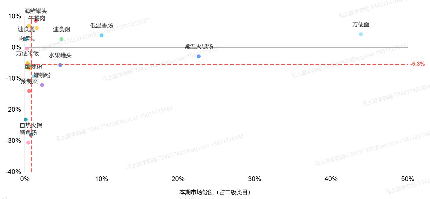 从市场份额增速的角度看,海鲜罐头和午餐肉尽管市场份额较小但增速可观,速食羹与肉罐头显示出较强的增长潜力。同时,方便面、低温香肠和速食粥也保持正向增长。与之相对的是,自热火锅类目增速同比约负20%,市场份额下滑明显,螺蛳粉和酸辣粉等类目也有一定市场份额同比负增长的趋势。
