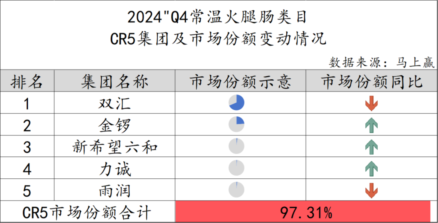在常温火腿肠类目中,CR5集团由双汇、金锣、新希望六和、力诚和雨润五个集团构成,占据市场份额的97.31%,常温火腿肠市场几乎完全被CR5集团主导,其他品牌的市场空间非常有限。在市场份额的同比变化中,只有双汇和雨润的份额有所下降,而其他集团均表现出一定程度的增长。