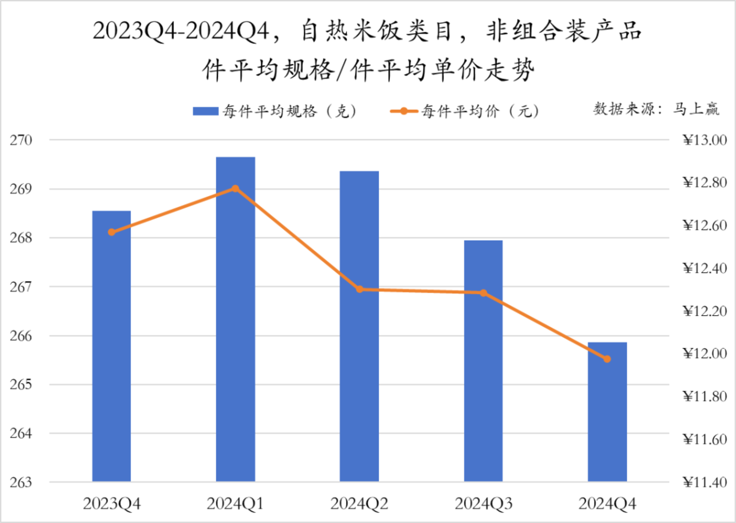在自热米饭类目中,非组合产品的件平均规格与件平均单价走势也呈现出一定的相似性。2024年Q1件均规格和件均价均达到最高点,此后呈现波动下滑的趋势,2024年Q4规格和均价降到最低值。