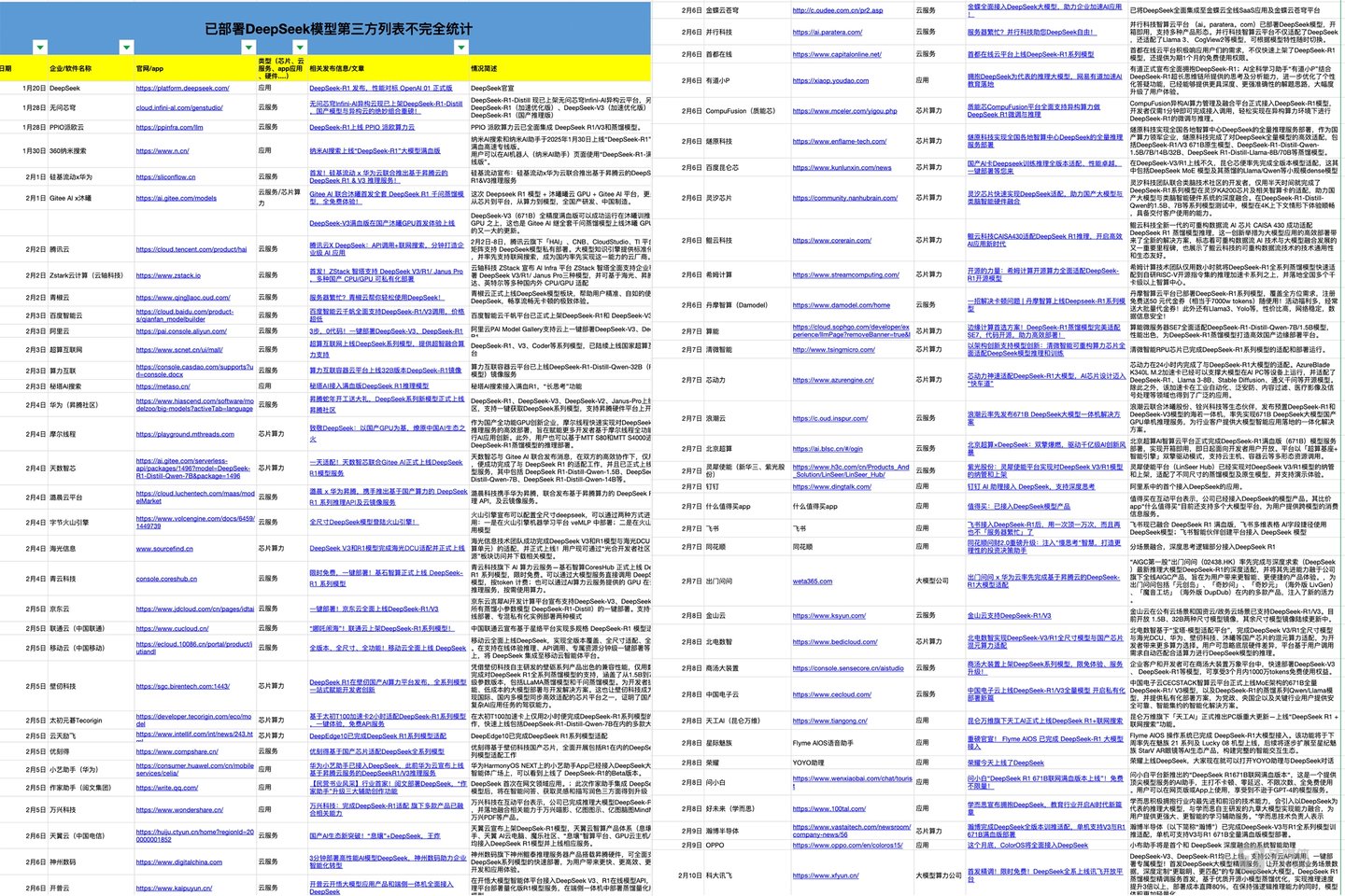 不止PopAi,据钛媒体AGI独家统计,截至2月11日,包括阿里云、腾讯云、火山引擎、华为、摩尔线程在内的超过70家 AI 算力、AI 云服务、AI 应用领域公司都宣布接入或适配DeepSeek模型产品。