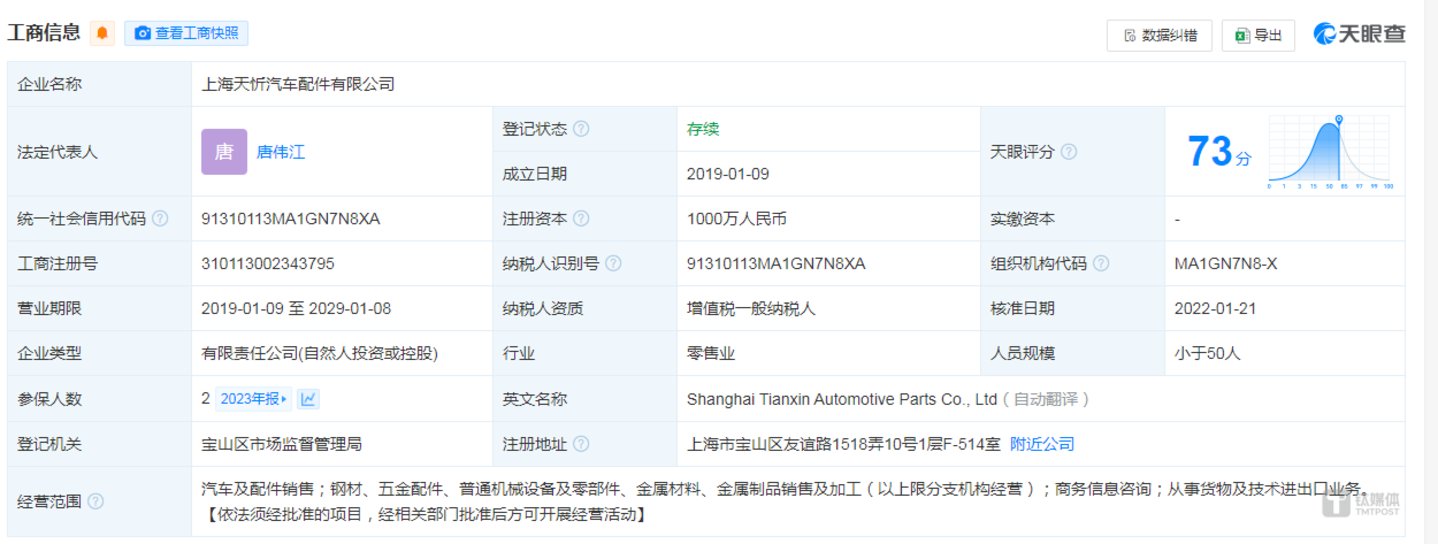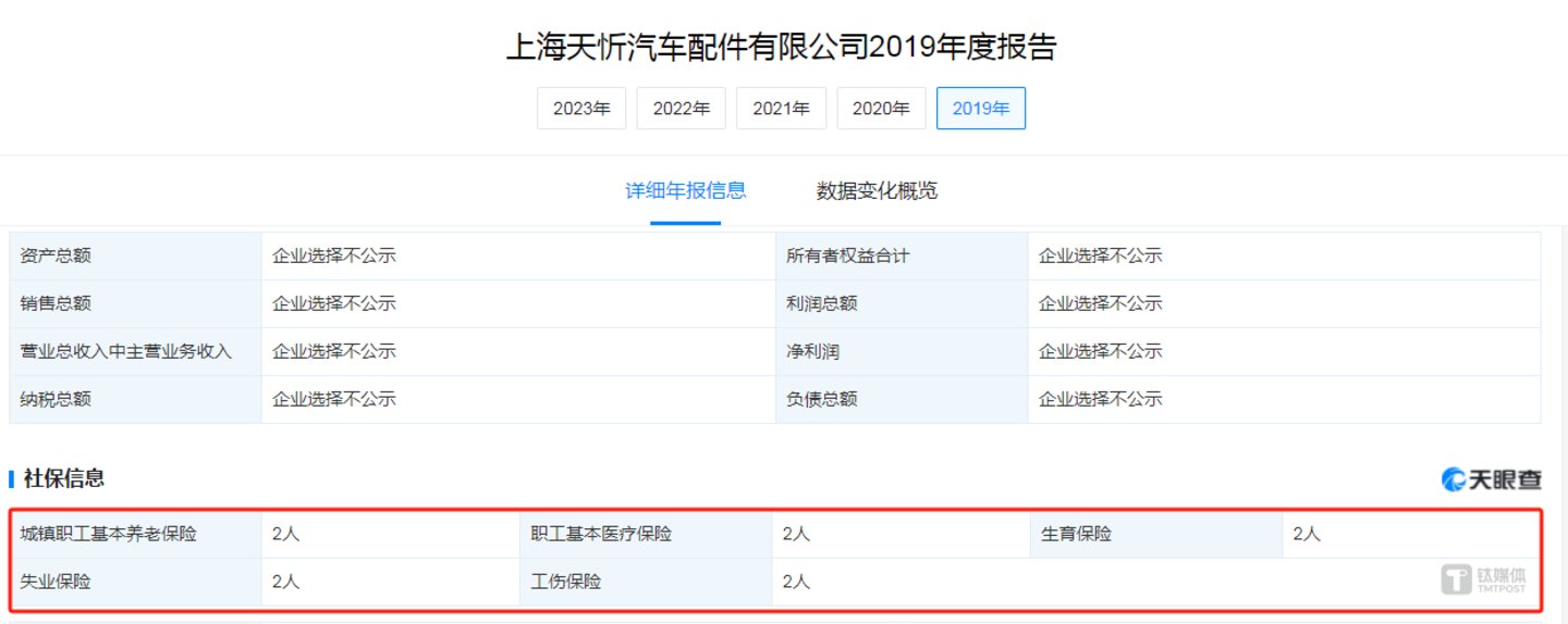 天眼查显示,上海天忻成立于2019年1月,注册资本为1000万元,同时,根据公司的年报,2019年-2023年,上海天忻均只有2人缴纳社保及公积金。