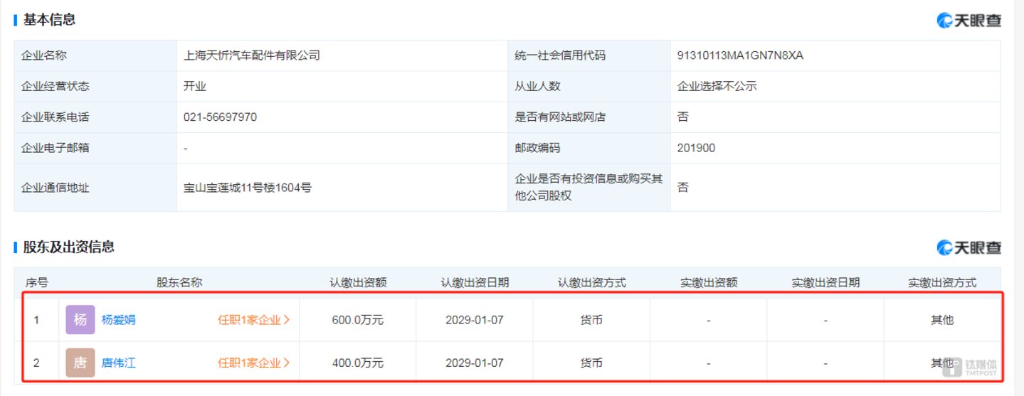 更令人疑惑的是,从上海天忻的股东情况看,2020年-2023年,公司的股东主要就是杨爱娟、唐伟江。同时,根据天眼查的资料显示,杨爱娟、唐伟江有且仅有上海天忻这一家公司。那么,杨爱娟、唐伟江到底何许人也?为何短短的4年时间,可以从利来智造获得10亿元的订单?