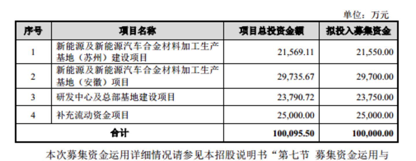 从募投项目上看,利来智造此次欲募集10亿元分别用于新能源及新能源汽车合金材料加工生产基地(苏州)建设项目、新能源及新能源汽车合金材料加工生产基地(安徽)项目、研发中心及总部基地建设项目、补充流动资金项目,具体情况如下: