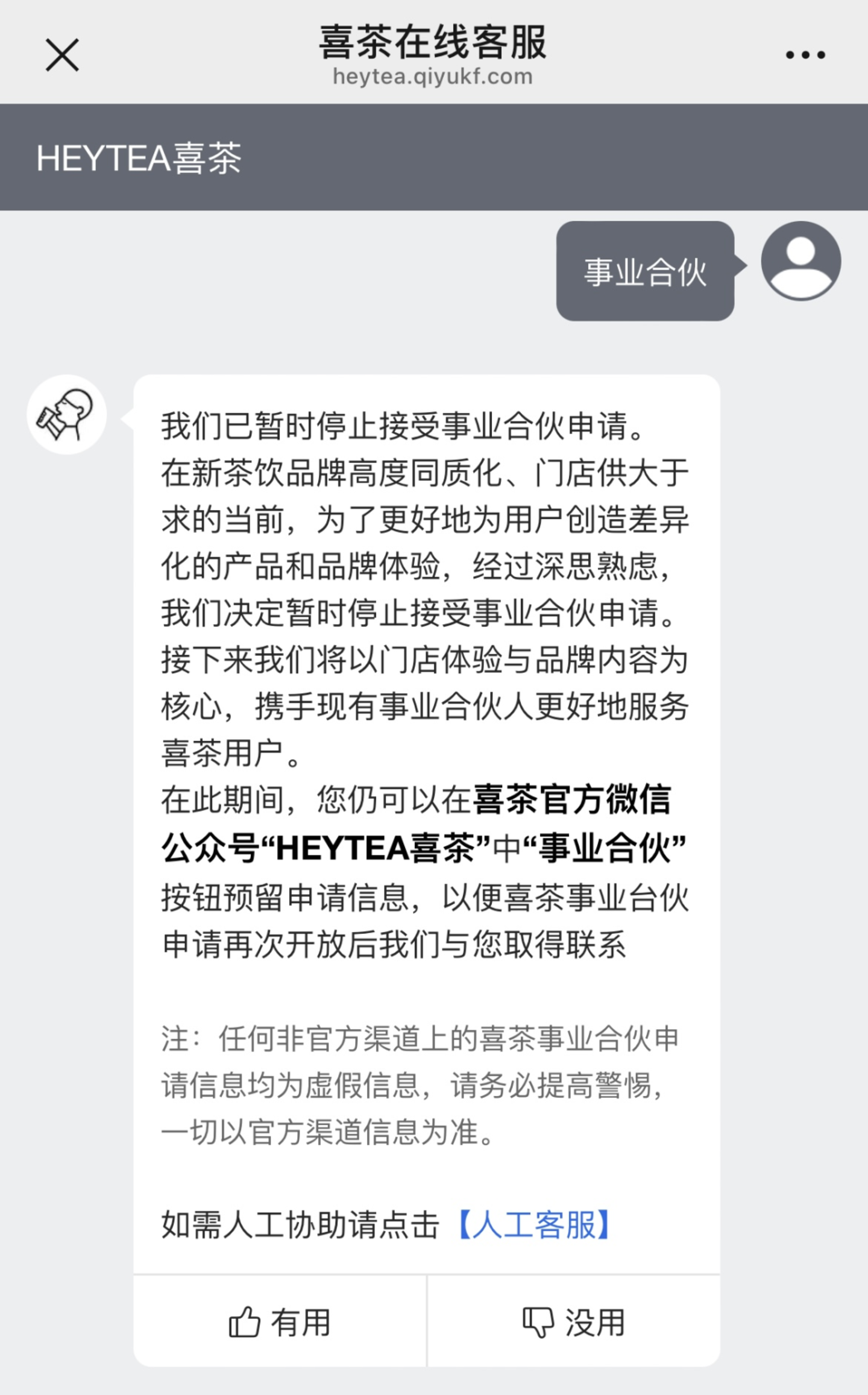 《号外工作室》通过喜茶官方微信,发现原本菜单栏中的“事业合伙”选项已被取消。与在线客服联系时,对话框内除了回复暂停加盟外,也提示“您仍可以预留申请信息,以便喜茶事业合伙申请再次开放后我们与您取得联系”。
