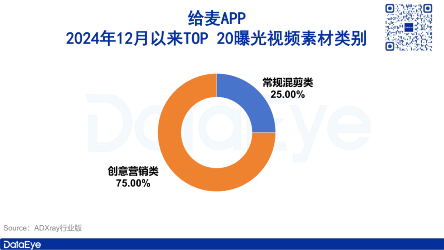 依据ADX行业版数据,DataEye研究院统计了2024年12月1日至2025年1月7日给麦APP高曝光视频素材TOP 20,发现其素材主要分为两种类型:常规混剪类、创意营销类。