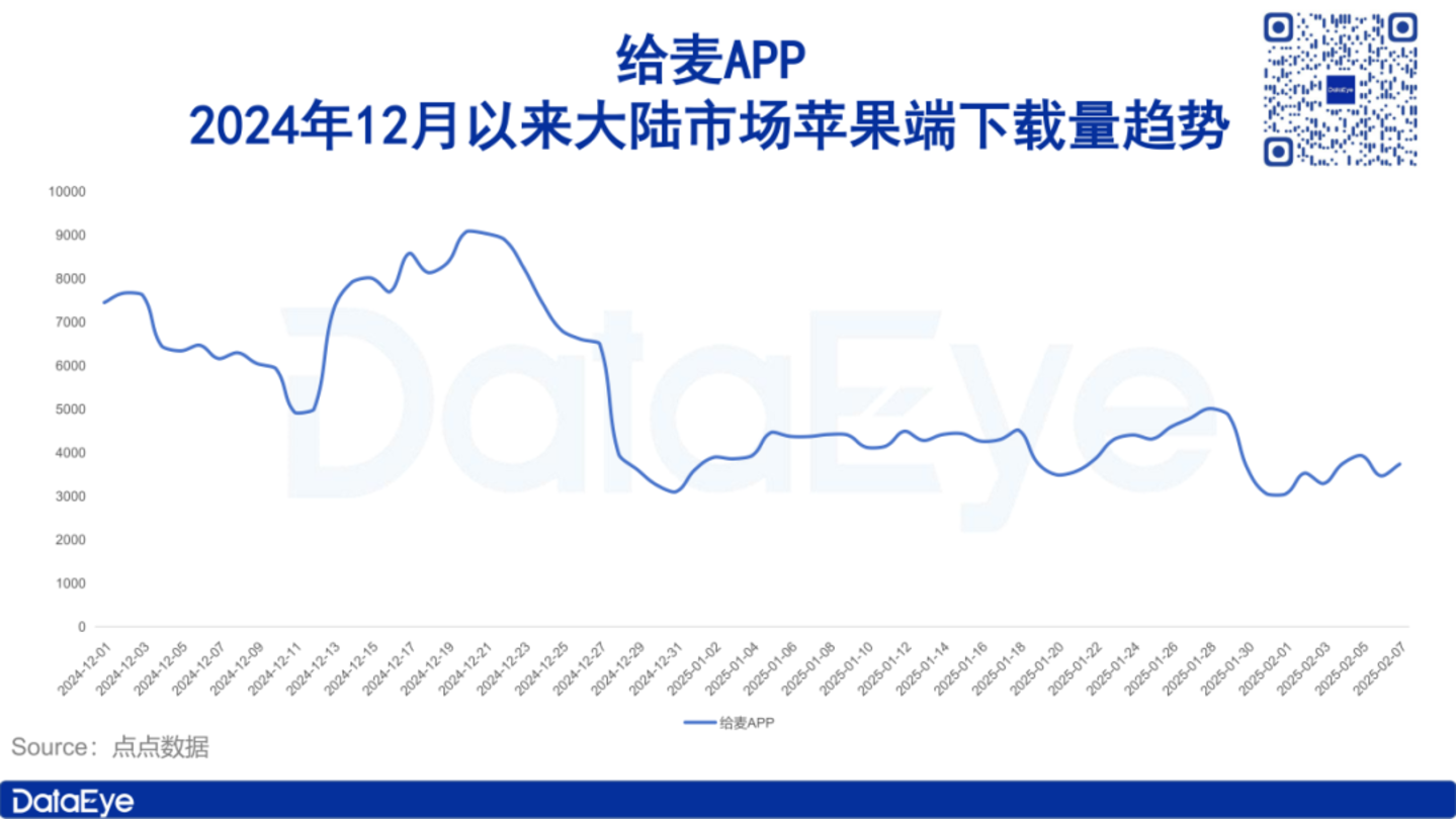第1阶段:2024年12月1日至12月下旬。该阶段为给麦APP下载量的高峰期,单日最高下载量超9000次;