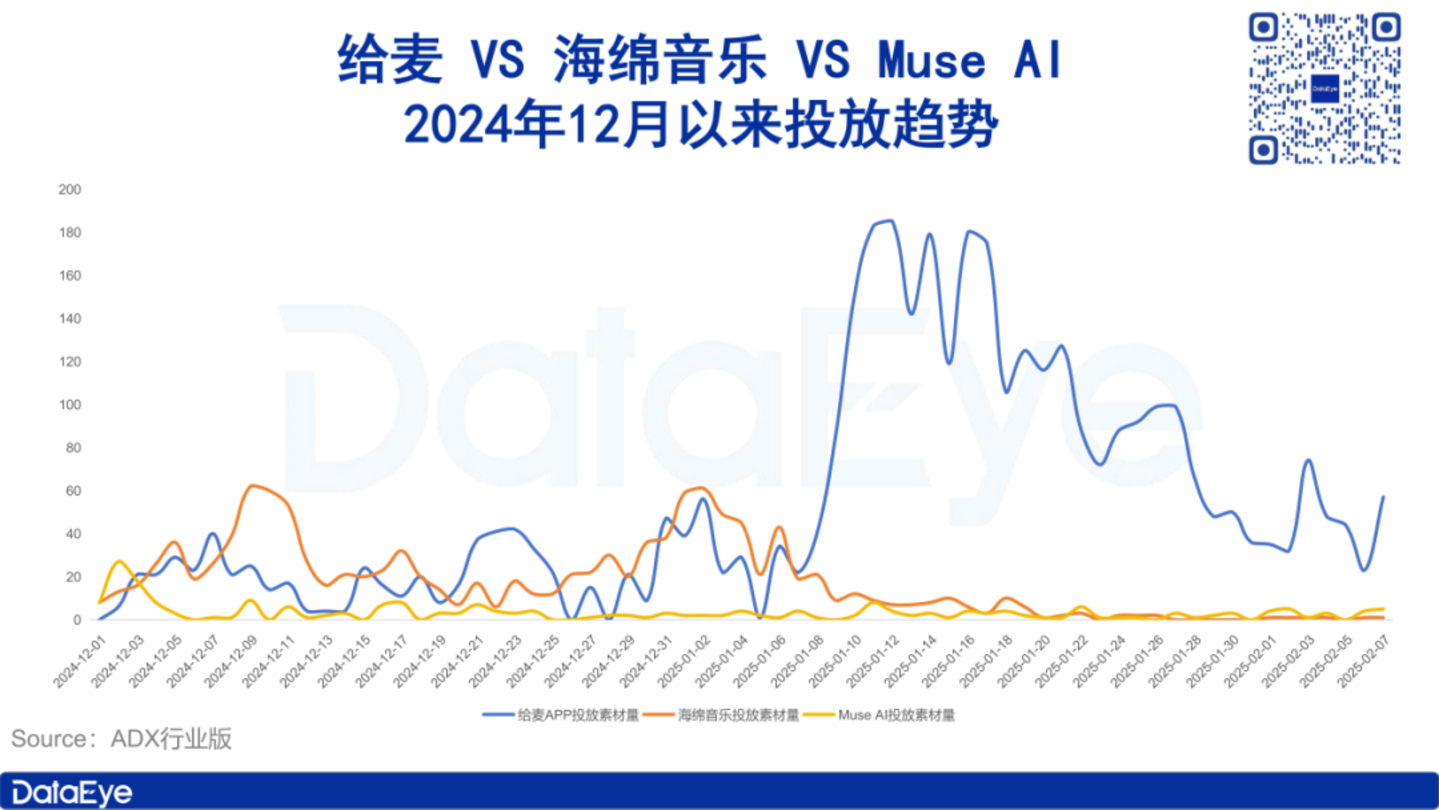 2025年1月中旬以来,给麦APP素材量大幅提升,日投放素材量最高超180组,明显领先于海绵音乐及Muse AI,海绵音乐素材量则大幅走低,与Muse AI日投放素材量均仅有几条。