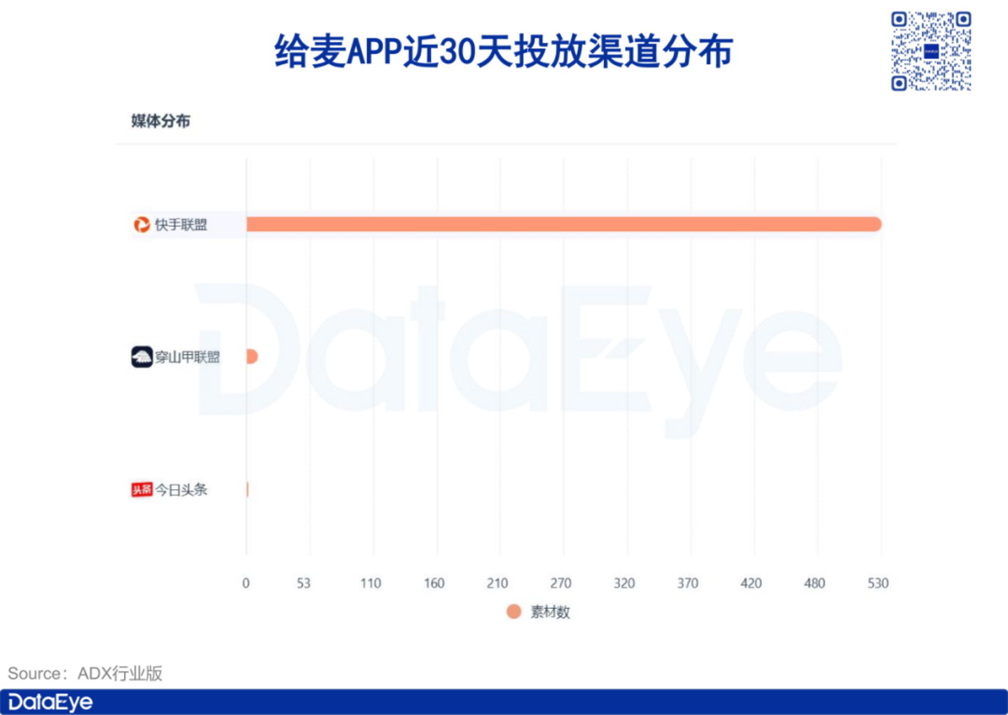 ADX行业版数据显示,近30天给麦APP投放渠道以快手联盟为绝对核心,穿山甲联盟、今日头条仅有极少数素材分布。