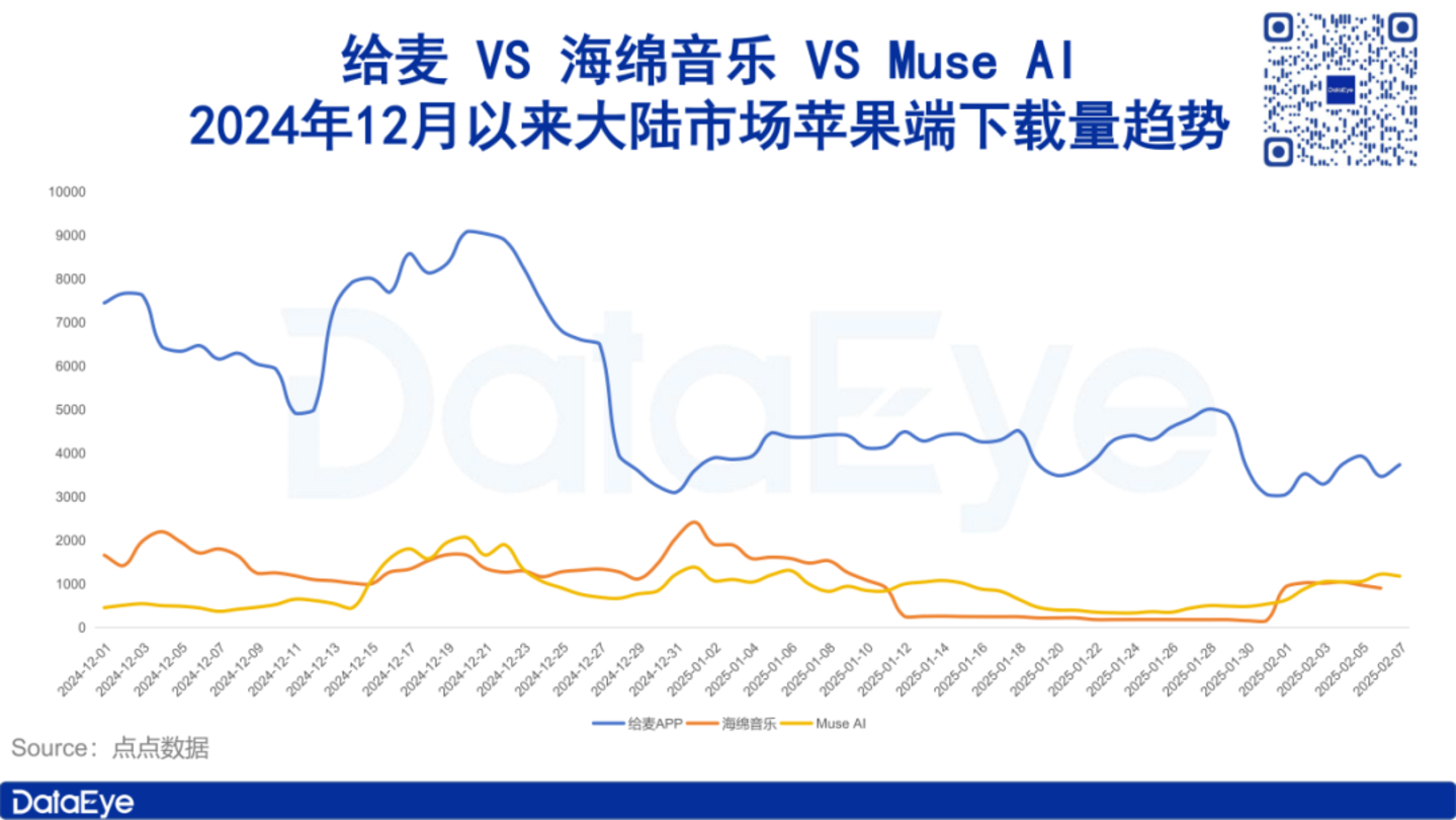 点点数据显示,2024年12月以来,给麦、海绵音乐及Muse AI三款应用在下载量上表现出明显的分层现象。