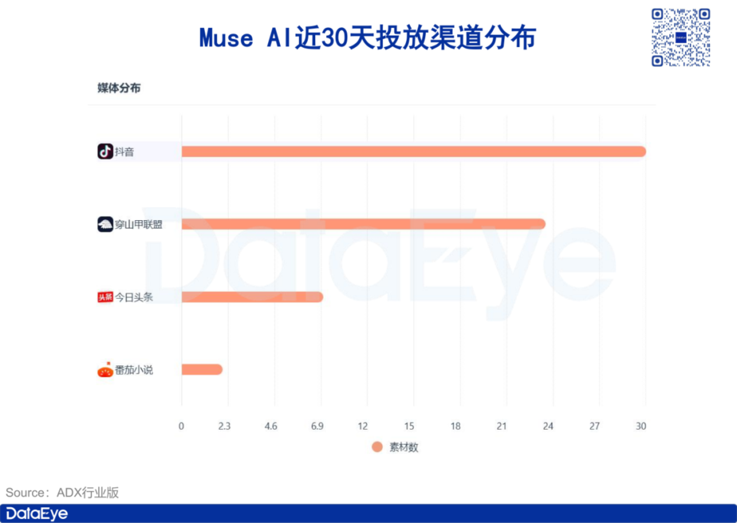 海绵音乐投放渠道分布以穿山甲联盟为主、抖音为辅;Muse AI投放渠道分布以抖音、穿山甲联盟为主,今日头条为辅,两款应用近30天投放渠道均为字节系媒体平台。
