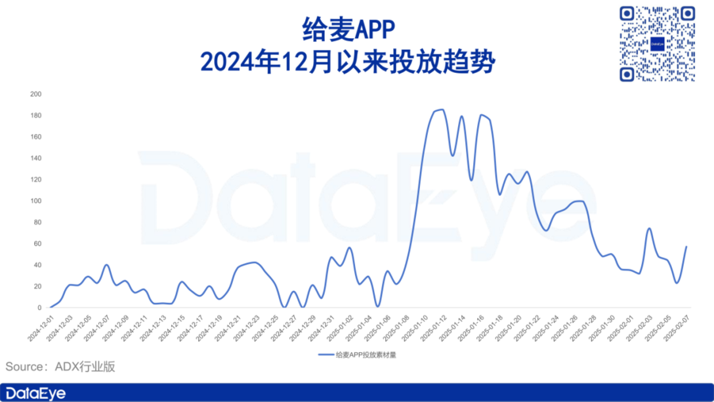 ADX行业版数据显示,2024年12月1日至2025年1月7日,给麦APP共投放素材量573组,其中图片336组,视频237组。