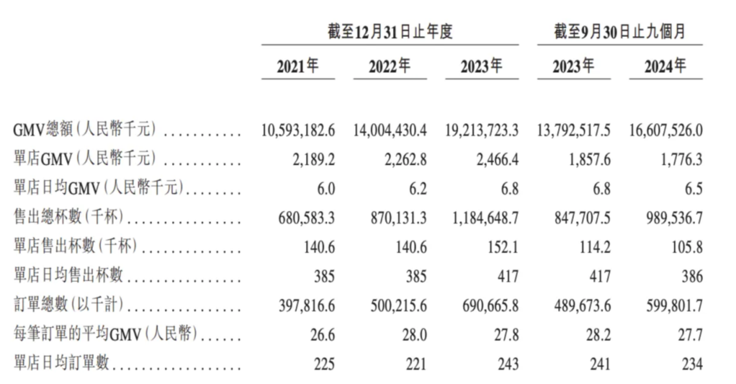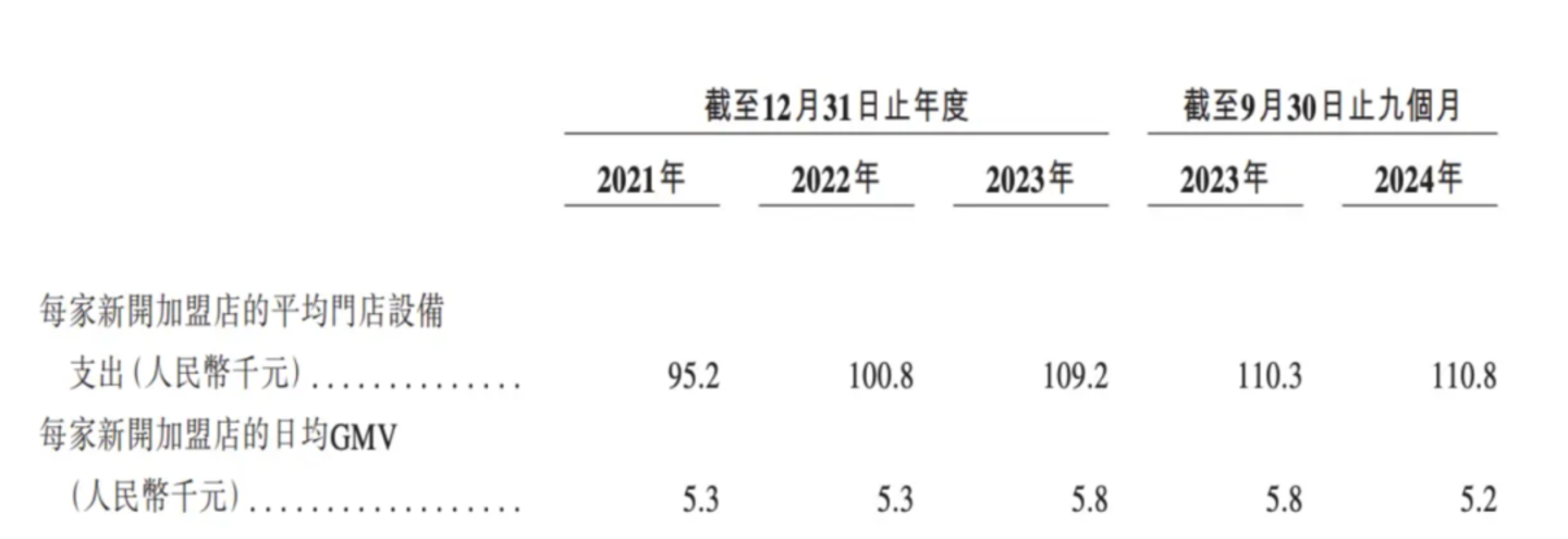 招股书显示,2023年古茗的加盟商单店经营利润达到37.6万元,加盟商单店经营利润率达20.2%,远高于其他现制茶饮店的15%及以下。不过,2024年前9个月,每家新开加盟店日均GMV5.2千元,比2023年同期的5.8千元减少600元,同比减少10.34%。