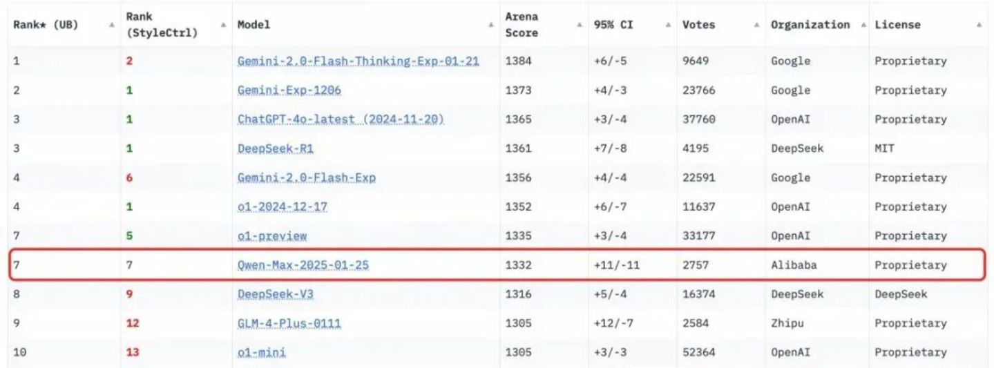 至今年1月,阿里通义新推的Qwen2.5-Max在AI模型评测平台Chatbot Arena的排名中位列全球第七,低于DeepSeek-R1但高于V3,排名靠前的其他模型均为美国公司所有。AI科学家李飞飞团队用50美元训练成本复刻的DeepSeek类推理模型,也是基于通义千问进行有监督的微调。