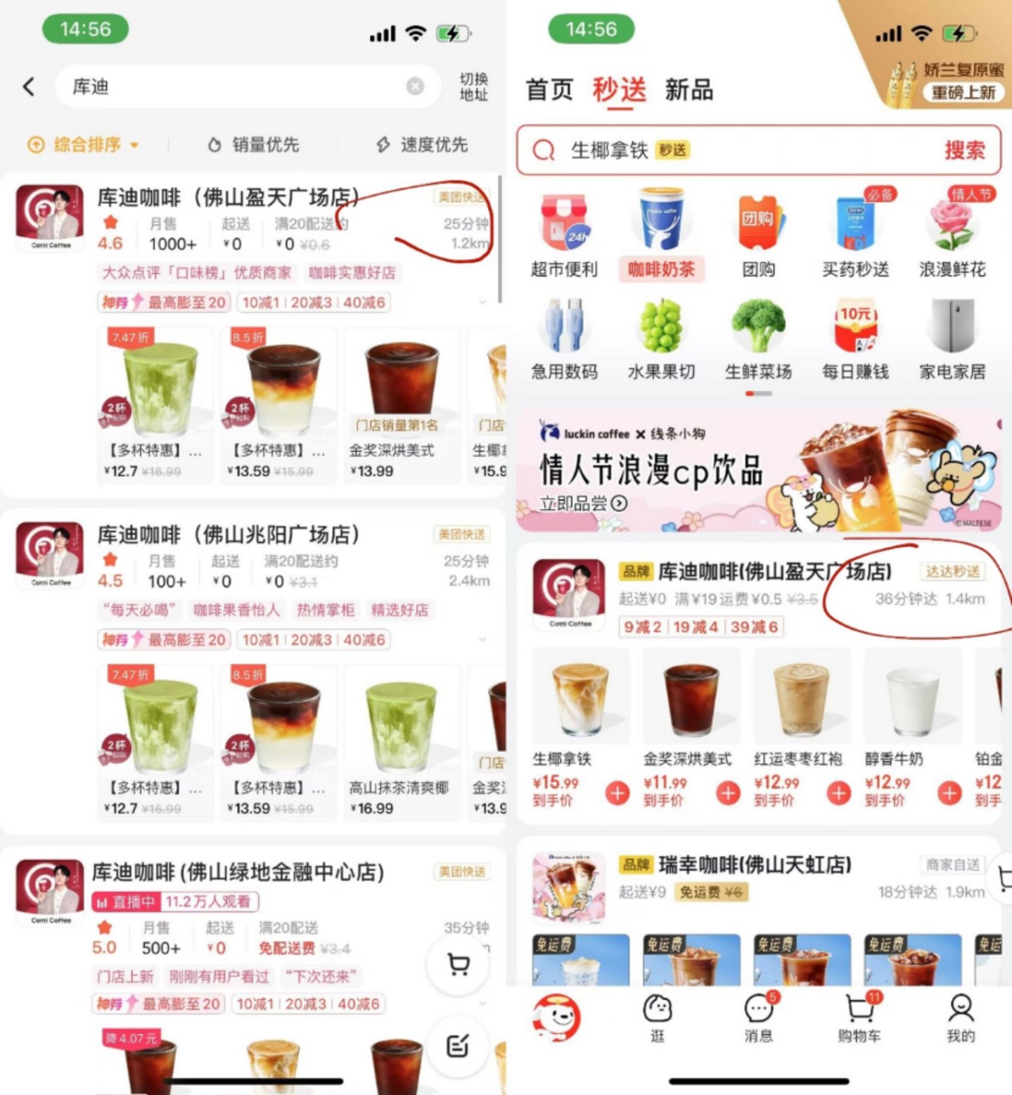 分别在美团和京东外卖上点同一个商家,京东外卖的配送时效要慢于美团配送;大部分商家在两个平台的产品价格都是一样的,但如果算上神券/红包等优惠券后,美团的售价更便宜一些。