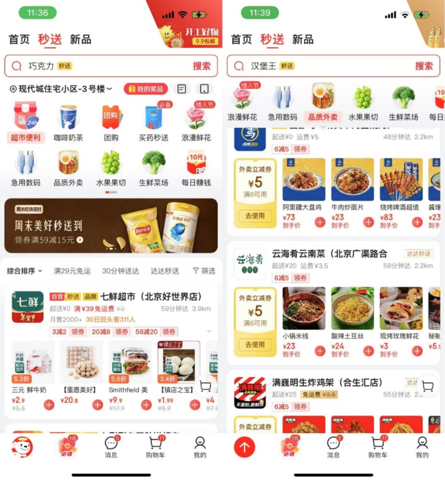 如今,“秒送”被设置在京东APP首页首屏位置,且相较于此前以咖啡奶茶等轻餐饮品牌为主的布局,已有更多不同类型商家入驻,外卖业务开始从边缘走向中心。