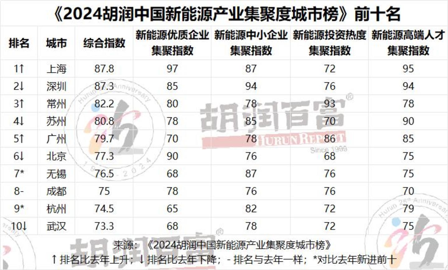 参考《2024胡润中国新能源产业集聚度城市榜》,上海以87.8的综合成绩暂列第一,但距离紧随其后的深圳、常州,仅有几分、甚至零点几分的微弱优势。