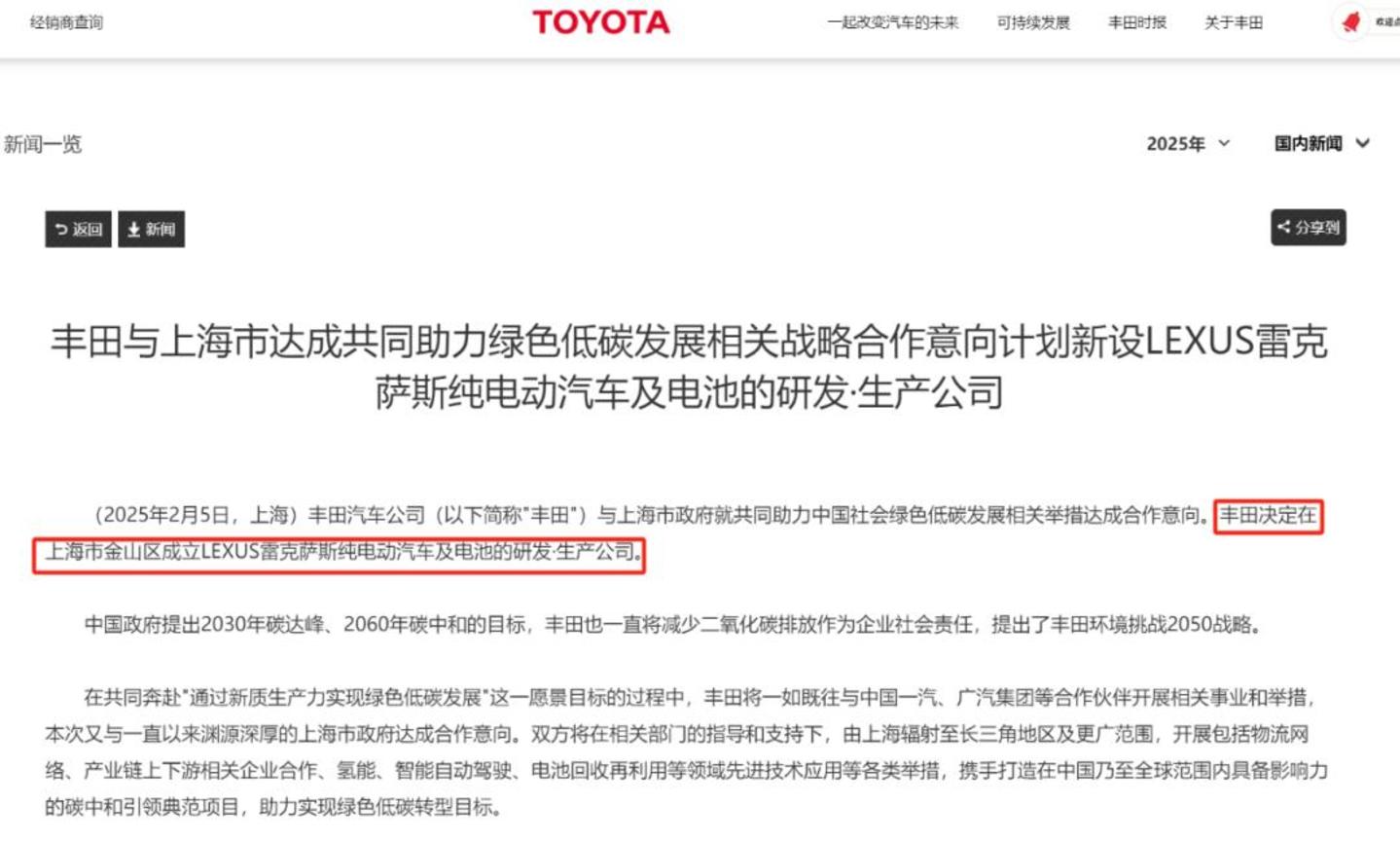 2月5日,丰田汽车发布公告称,决定在上海市金山区成立雷克萨斯纯电动汽车及电池的研发、生产公司,计划于2027年投产。