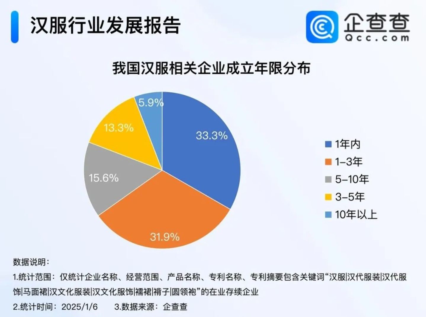 受这波热潮影响,企查查数据显示,截至2025年1月6日,我国现存7365家汉服相关企业。成立年限上,超六成汉服相关企业于3年内成立,其中成立于1年内的企业最多,占比高达33.3%。