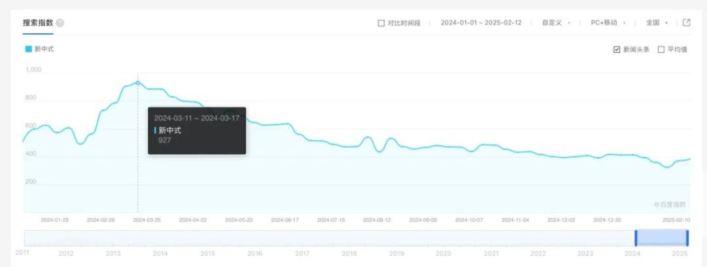 参考百度及微信指数,可以直接看出今年新中式热度的滑落。在百度搜索指数上,新中式的峰值出现在2024年3月11日—3月17日,为927,而今年春节期间,新中式的搜索指数一直相对平稳,没有波动,徘徊在400左右。