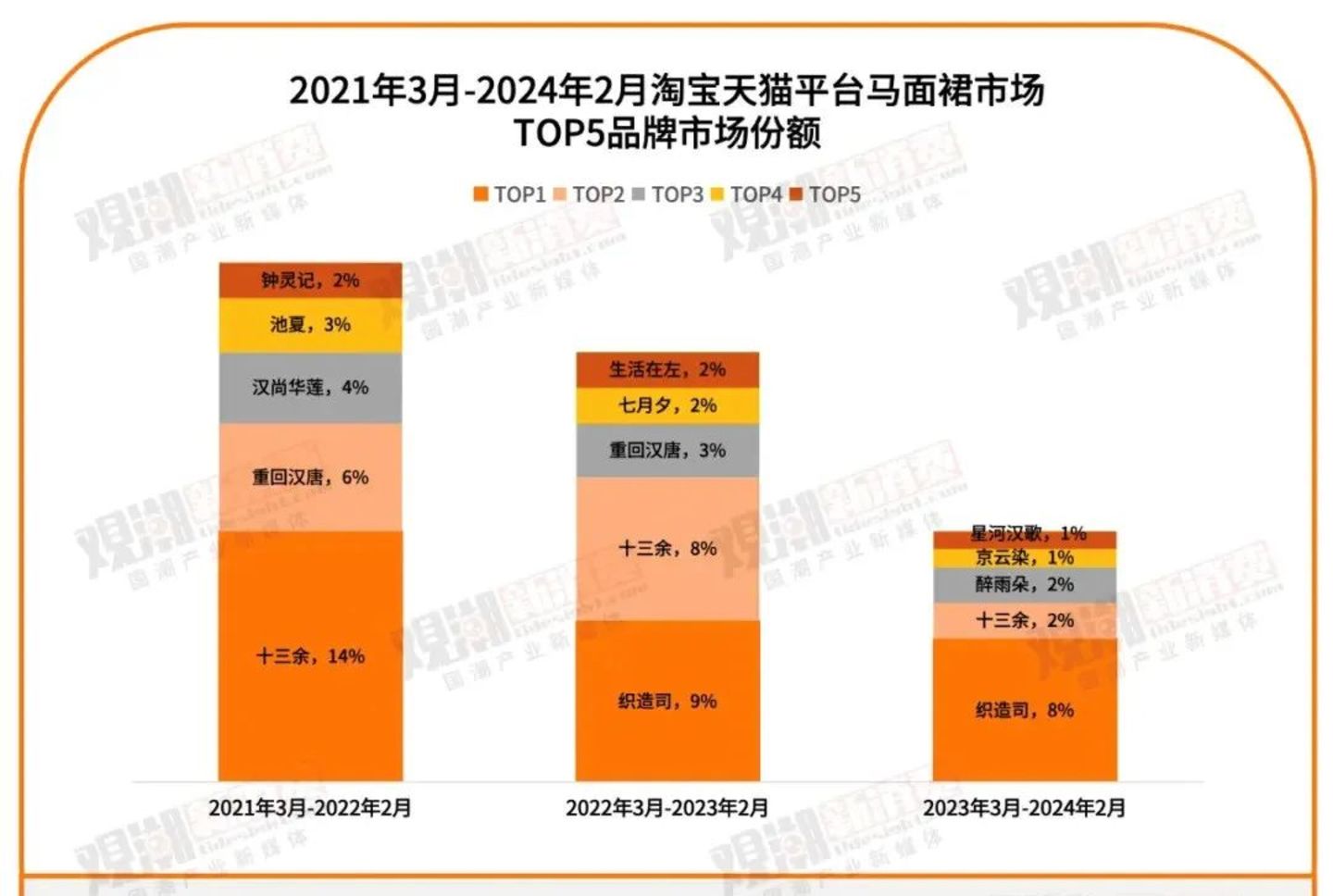 以马面裙为例,作为新中式潮流中的最大爆品,马面裙销量的暴涨,捧红了织造司等新兴汉服品牌,也改写了汉服市场的格局。在天猫、淘宝平台上,我们看到,汉服品牌集中度持续下降,CR5由2021年的29%下滑至2023年的14%,市场更加分散。