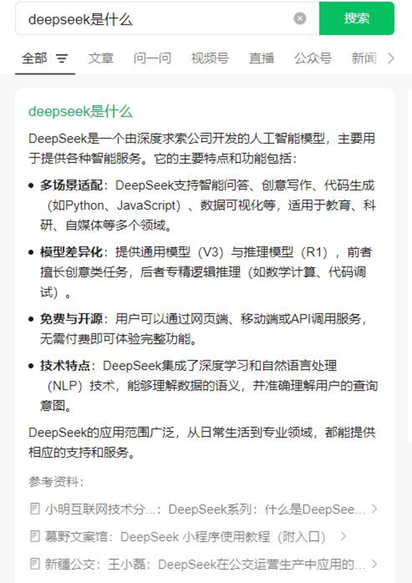如今,微信又给搜索增添了另一个模型——DeepSeek,其数据库除了公众号外还接入了全网搜索内容,因此微信此番接入DeepSeek,被业内称之为“王炸”般的存在。