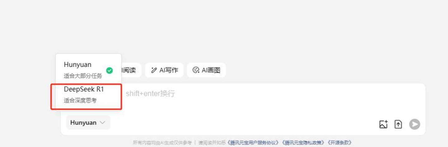 从接入的情况来看,腾讯元宝直接做了一个自由切换模型的功能键,点击即可以将混元模型切换成满血版DeepSeek-R1。