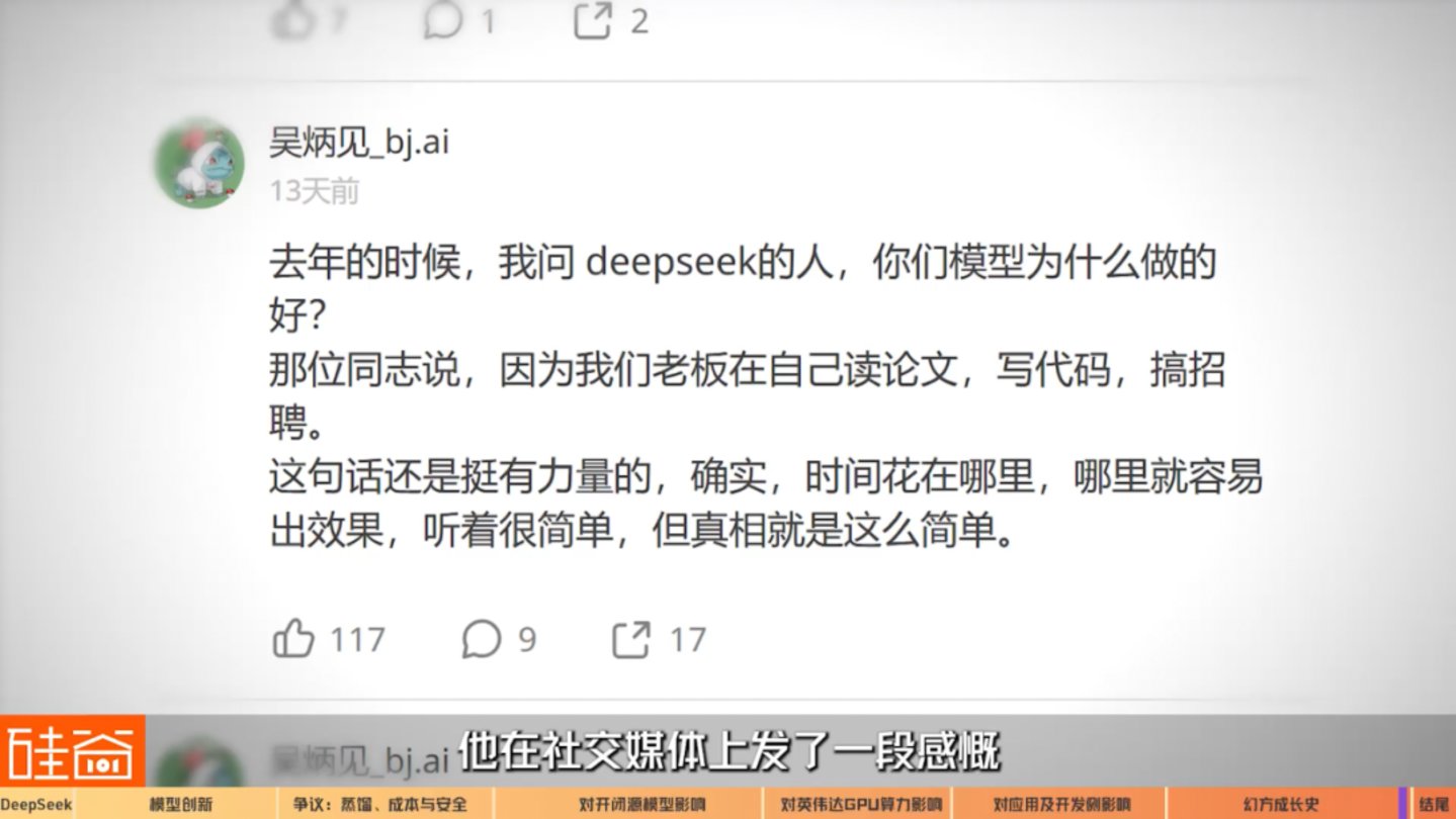 他去年的时候去问DeepSeek的人“为什么你们的模型做的那么好”,对方回答说因为我们的老板自己读论文、自己写代码、自己做招聘,时间花在哪里,哪里就容易出效率,听着很简单,但真相往往就是这么纯粹。