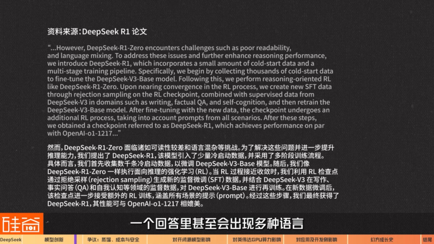 DeepSeek自己也提到R1-zero的可读性很低,一个回答里甚至会出现多种语言。所以DeepSeek团队最终还是创建了新的监督微调(Supervised Fine-Tuning,简称SFT)数据集,重新训练V3基础模型得到今天的R1。